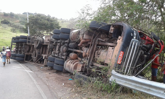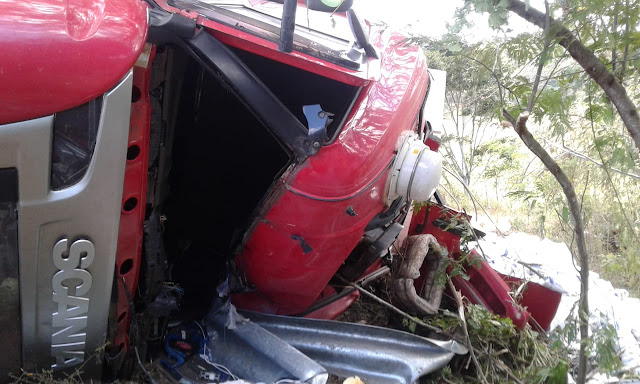 Chegando ao local a equipe da unidade de resgate, se deparou com uma Scania R440, de cor vermelha, ano 2013, placa AVO 4548 – Goiânia/GO, tombada às margens da rodovia.