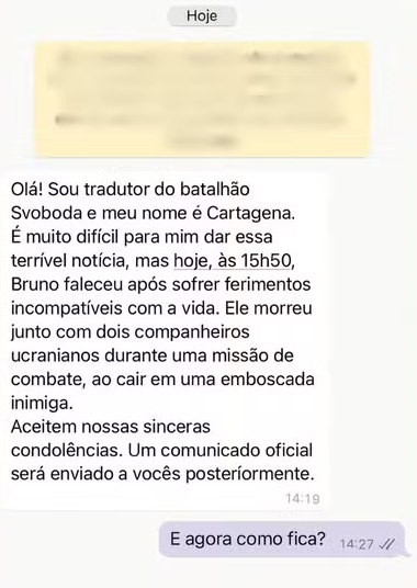 De acordo com a esposa de Bruno, a comunicação sobre a morte foi feita por uma responsável pela equipe ucraniana com quem ele atuava. Ele estava com outros três combatentes, dois ucranianos e um brasileiro. Apenas o companheiro brasileiro de Bruno sobreviveu, mas permanece internado e sem condições de fala, segundo os relatos.