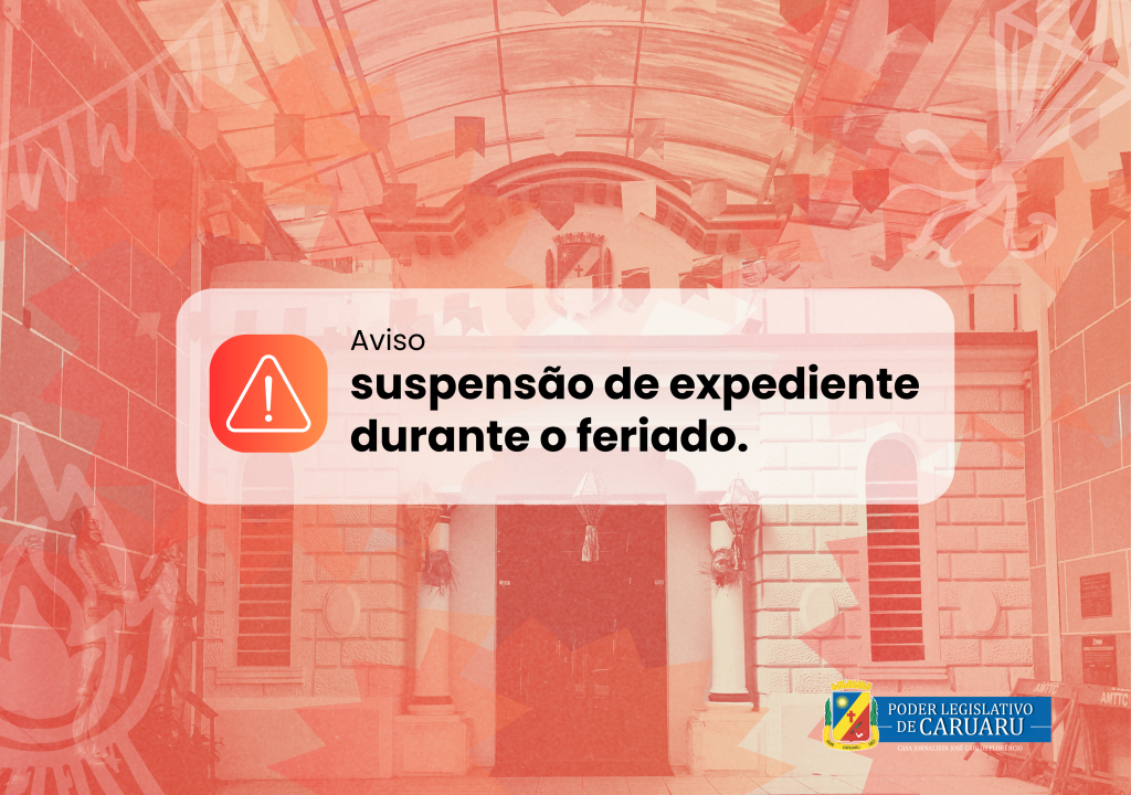 A Câmara Municipal de Caruaru informa que, em razão dos feriados de Corpus Christi (19/06) e das comemorações de São João (24/06), o expediente na sede do Poder Legislativo será suspenso a partir da quinta-feira, dia 19 de junho, conforme decreto municipal que estabelece ponto facultativo no período.