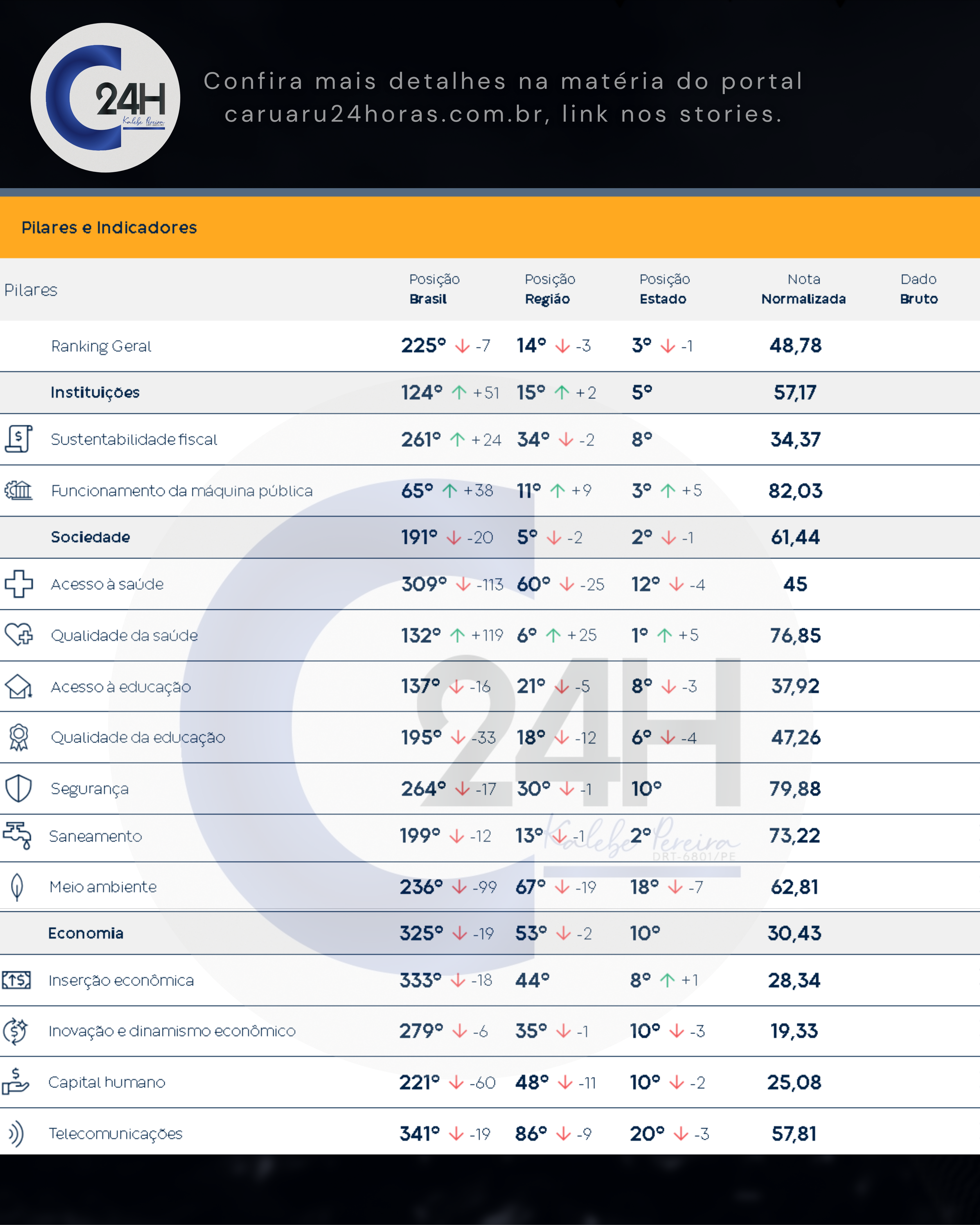 Embora o município ainda mantenha desempenho acima da média em algumas dimensões avaliadas pelo CLP,no ranking geral, Caruaru caiu 7 posições no cenário nacional e 1 no estadual, enquanto na análise regional houve recuo de 3 colocações. Essa queda acontece devido à perda de ritmo em alguns pilares, como “Acesso à saúde”, “Meio ambiente” e “Telecomunicações”, em relação a outros municípios.