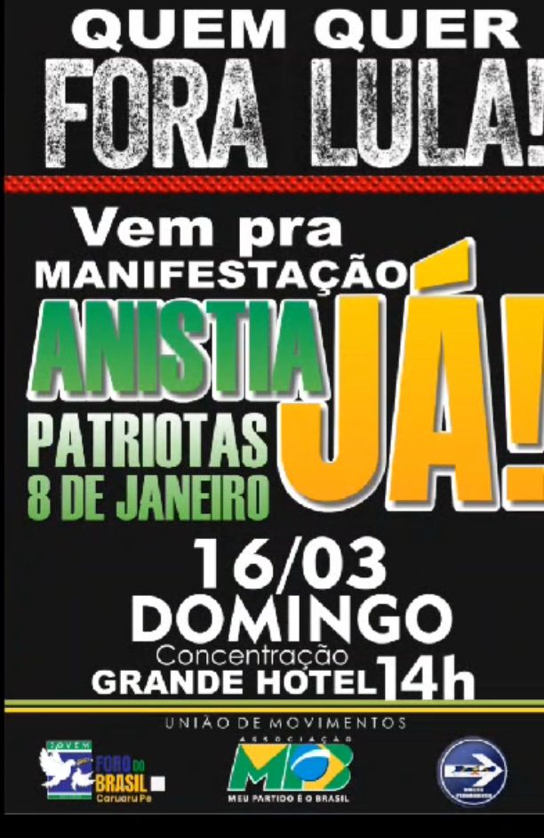 As manifestações programadas para o próximo domingo (16/03), no Brasil têm como objetivo cobrar dos três poderes centrais a anistia para os presos do 08 de janeiro, além de expressar descontentamento com o governo do presidente Lula. Em Caruaru, as manifestações acontecerão na frente do Grande Hotel, a partir das 14h, e serão promovidas pelos movimentos: Meu Partido é o Brasil, Direita Pernambuco e Foro do Brasil (Caruaru-PE).