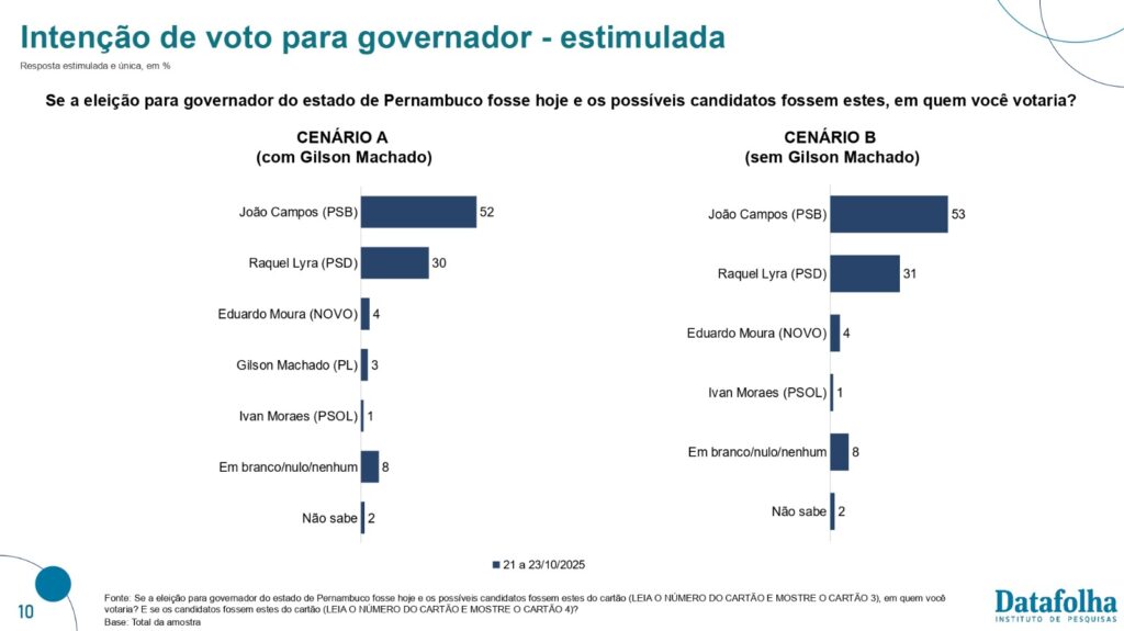 Em um eventual segundo turno, o levantamento mostra Campos ampliando sua vantagem: ele teria 58% dos votos contra 35% de Raquel Lyra. A pesquisa ouviu 1.022 pessoas entre os dias 21 e 23 de outubro, em todas as regiões do estado, com margem de erro de 3 pontos percentuais e nível de confiança de 95%.