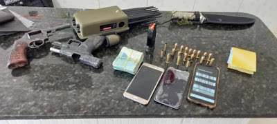 Os elementos estavam armados com uma pistola calibre ponto 40 com 14 munições e um revólver calibre 38 com cinco munições, sendo três intactas e duas deflagradas, uma delas foi roubada de uma empresa de segurança privada e além das armas os policiais encontraram um bloqueador de sinais, celulares roubados e a quantia de R$ 8.228,00 que subtraíram da vítima.