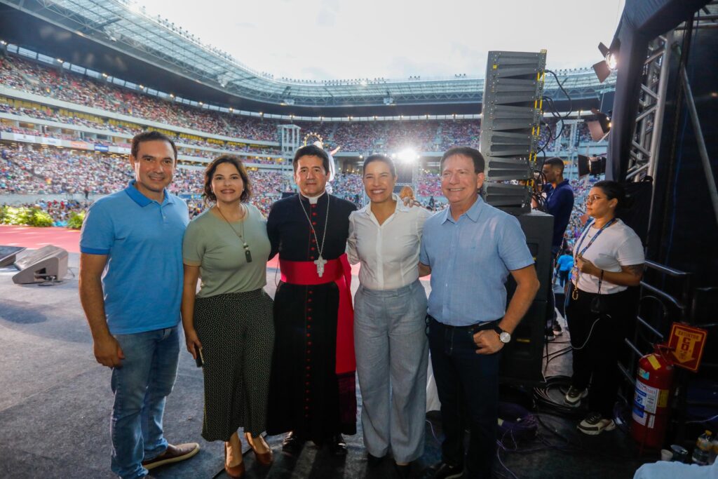 A governadora Raquel Lyra participou, neste domingo (19), do encerramento do maior evento religioso católico do Nordeste, a celebração dos 35 anos da Obra de Maria, comunidade formada por missionários, padres e fiéis da Igreja Católica. Realizado na Arena de Pernambuco, em São Lourenço da Mata, o evento reuniu mais de 40 mil pessoas de vários estados brasileiros e países, entre lideranças eclesiásticas, artistas, fiéis e autoridades, como a vice-governadora Priscila Krause.
