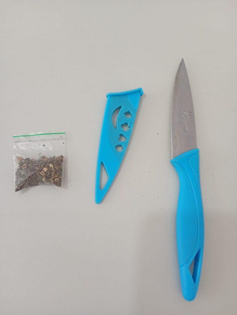 Na revista pessoal, os agentes encontraram com o indivíduo um invólucro contendo substância análoga à maconha, além de uma faca.