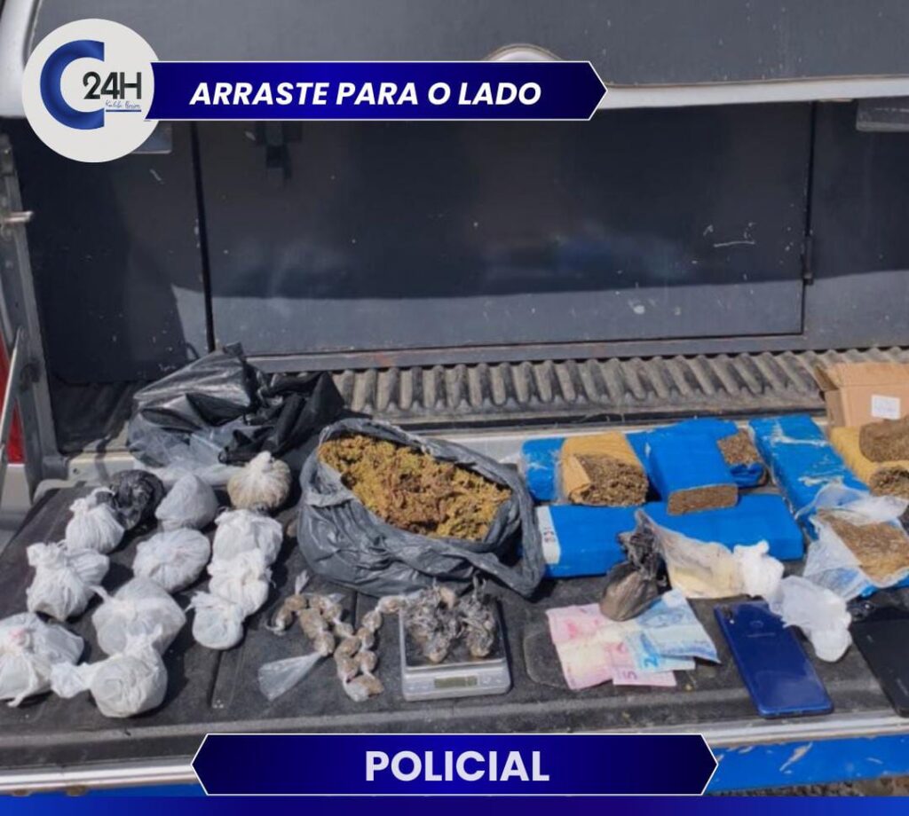 Durante as diligências, o efetivo realizou uma varredura na área e encontrou, em uma residência abandonada nas proximidades, uma quantidade maior de entorpecentes. Ao todo, foram apreendidos aproximadamente 4 kg de maconha, 250 gramas de cocaína e 50 gramas de crack.