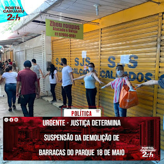 A 2ª Vara da Fazenda Pública de Caruaru suspendeu a demolição de barracas no Parque 18 de Maio pela Prefeitura de Caruaru, através de liminar publicada na tarde desta quinta-feira (04). Segundo a ordem judicial, a desocupação será adiada para o dia 31 de dezembro de 2020, por conta da pandemia do novo coronavírus.
