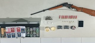 Dando sequência às diligências, o policiamento chegou até um depósito, onde a esposa do terceiro envolvido franqueou a entrada do efetivo. No local, foram encontrados dois pacotes de chumbo para recarga de arma de fogo, três invólucros contendo cocaína e um celular. Em um segundo depósito, foram localizados uma caixa contendo dez cartuchos calibre .36 intactos, um saco plástico com 22 gramas de maconha e diversos saquinhos plásticos utilizados para embalar entorpecentes.