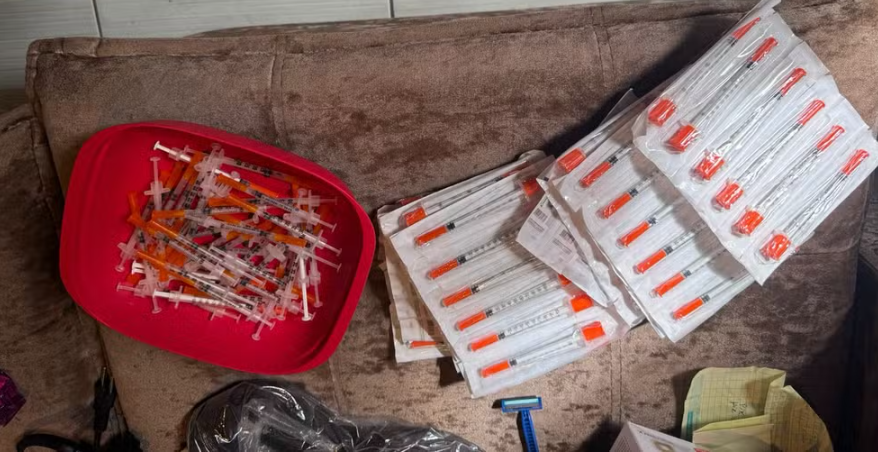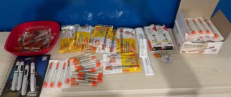 Foram apreendidas várias canetas emagrecedoras, seringas farmacêuticas, ampolas e cadernos de anotaçõe;