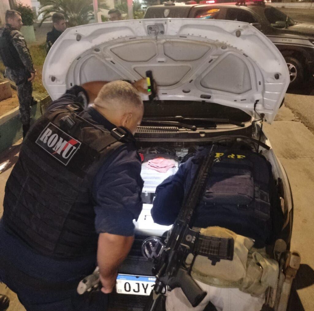 Diante da denúncia, os agentes montaram um ponto base na entrada da cidade e identificaram um veículo com as mesmas características. A abordagem foi realizada e, no interior do carro, estavam dois ocupantes.